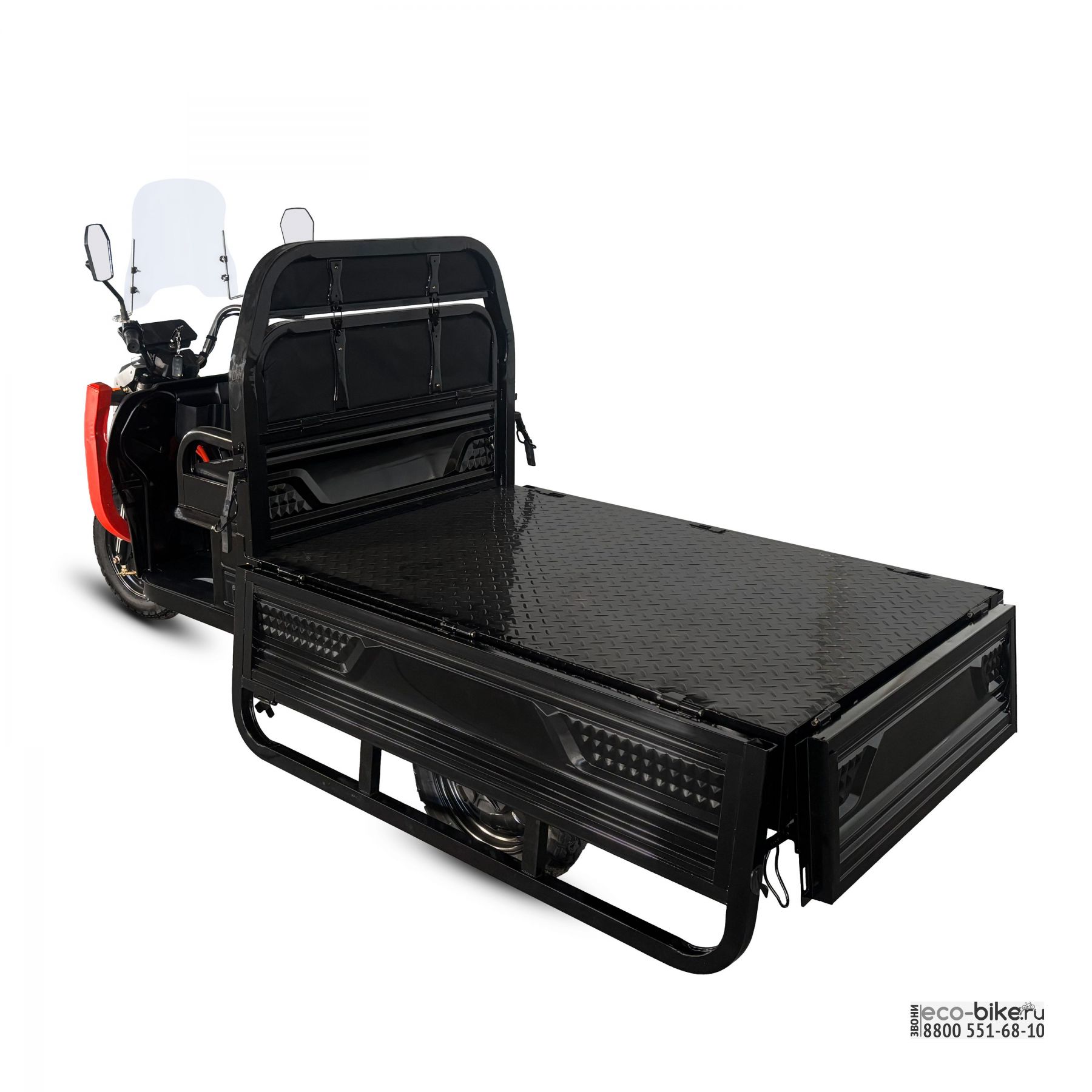 Оптимальный кузов размером 1500 × 1000 × 450 мм, усиленный вертикальными 2 рейками, откидные борта на быстросъёмных петлях с ограничителями, цельные усиленные борта из ребристого металла, двойной железный бампер, передние световые элементы, хромированный руль с перекладиной, тормозная система с ручником, усиленный грузовой мост, 5-листовая рессорная подвеска, надёжная батарея 60V 48 А·ч и пониженная передача — всё это делает модель готовой к перевозке тяжёлых грузов в ежедневной эксплуатации.